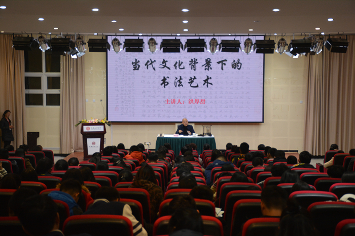 洪厚甜以自己40年的书法艺术研究为前提,从历史的角度给在场师生们阐述了中国书法的发展历程。他从艺术的音乐、画作、自然方面,讲述在当代应该如何研究书法、发展书法。他提出,在书法学习过程中,要重视“向谁学、怎么学”,强调选择好老师的重要性。