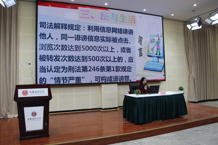 张丹讲述了12.4全国法制宣传日的设立背景及法制宣传标志的意义,表明了在创建法治社会的大背景下党和国家推广法治理念和向全民普法的坚定信念。她就宪法是什么,十九大报告中提到的合宪性审查的介绍,法与生活三个方面的内容为同学们做了详细的讲解。张丹指出,宪法是国家具有最高法律效力的根本大法,合宪性审查就是对宪法以下的法律文件是否符合宪法进行审查,以保证宪法至上的权威性。就法律与生活的关系,她强调法律与公民的日常生活息息相关,涉及到我们衣、食、住、行等各方面的利益。讲座过程中,张丹老师用诙谐幽默的语言充分带动了同学们的学法乐趣,让大家了解了基本的法律知识,知道了维护和遵守宪法与法律法规是每一个公民应尽的义务。